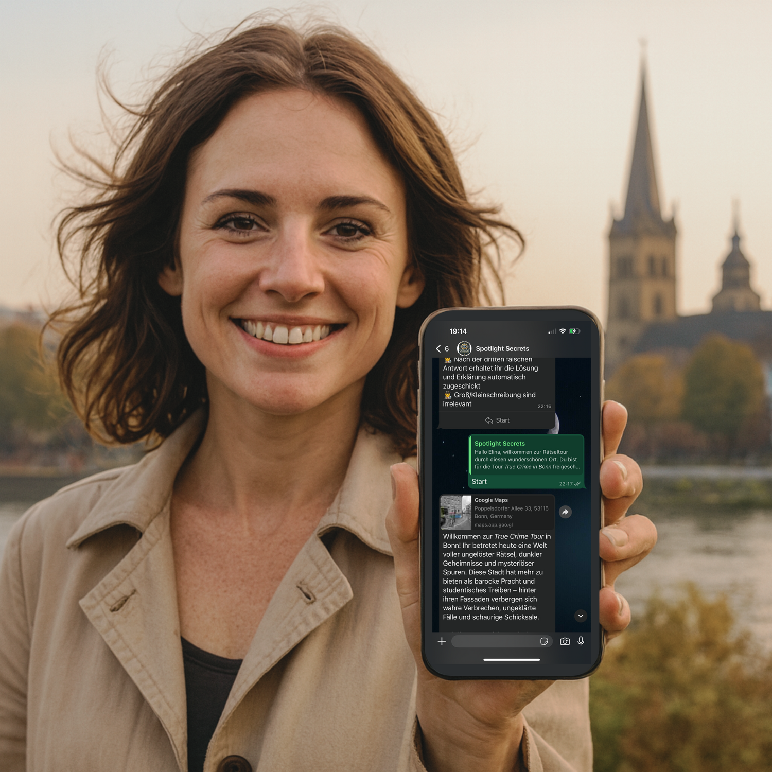 Vergiss langweilige Fakten & Jahreszahlen! Unsere interaktiven Stadtführungen über WhatsApp Nachrichten führen dich auf eigene Faust durch Bonn mit spannenden Rätseln, versteckten Orten & echten Geheimnissen. Ob True Crime, Mittelalter oder Streetart - bei unseren Outdoor Escape Spielen ist für jeden was dabei!